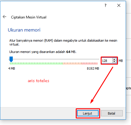 2.kita tentukan ukuran memori atau RAM pada mesin virtual.